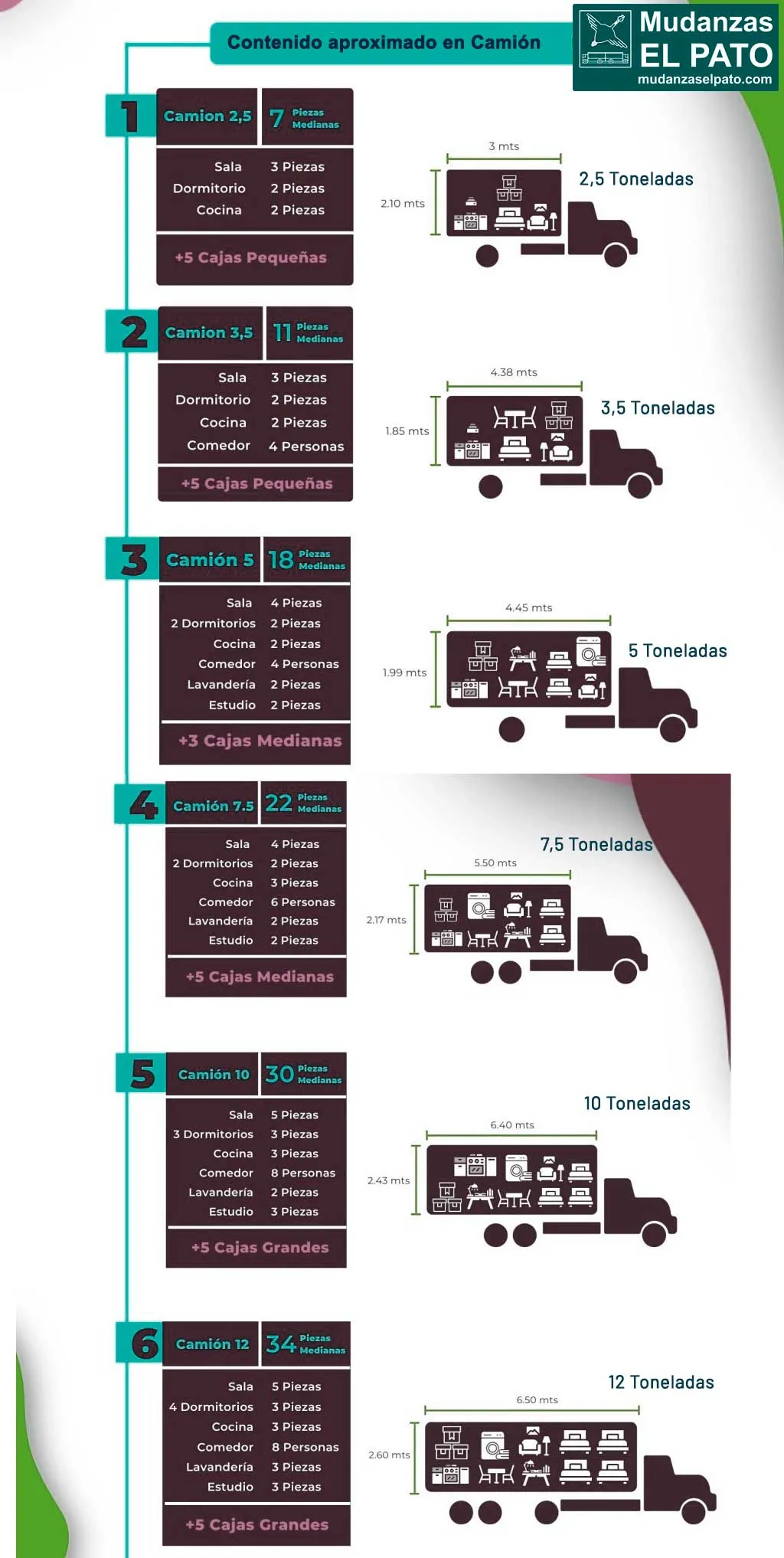 Mudanzas El Pato es un referente en el sector de mudanzas y nuestra experiencia contrastada y dilatada nos permite compartir contigo información aproximada de qué se puede contener un los diferentes camiones de mudanza. Por supuesto, te proponemos que contactes con nuestro departamento comercial para que te orientemos y te ayudemos a determinar cuál es el vehículo idóneo para tu mudanza.