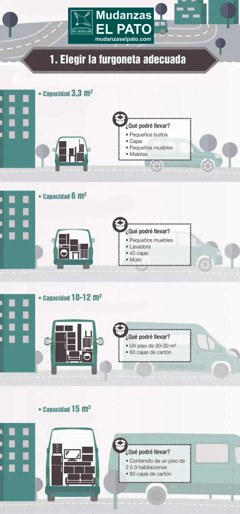 En un articulo anterior te hablamos ya sobre los tipos de camiones más utilizados en servicios de mudanzas y sus capacidades. Sin embargo también los profesionales de las mudanzas pueden utilizar vehículos más pequeños como furgonetas que son utilizados como vehículos auxiliares que completen a otros camiones de manera optimizada para la carga de un servicio de mudanzas o para completar mudanzas pequeñas o express. En este artículo hempos preparado una infografía que recoge las diferentes capacidades que pueden asumir este tipo de furgonetas.